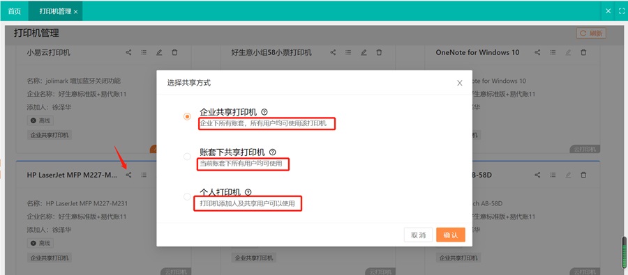 4)可以对已经添加的打印机进行共享,是该企业下所有账套所有用户均可使用该打印机,还是当前打开账套下所有用户均可使用,还是仅对极个别的用户进行共享打印机使用