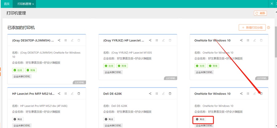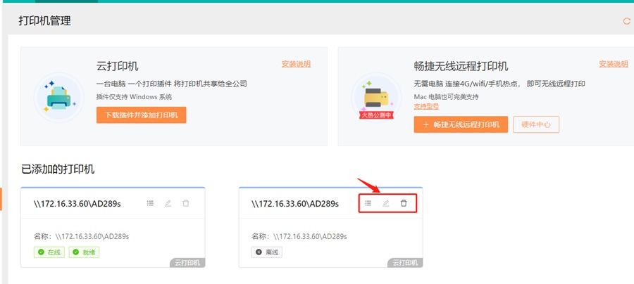 3)查看已添加的打印机,可对已离线打印机进行删除,如需要编辑在线打印机,请到云打印插件里进行编辑操作
