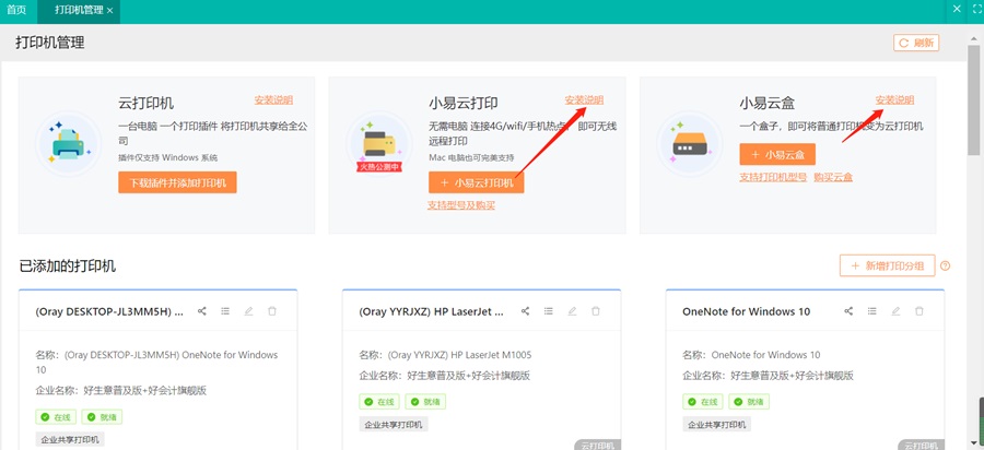 2、添加小易云打印和小易云盒,单击安装说明查看详细操作步骤