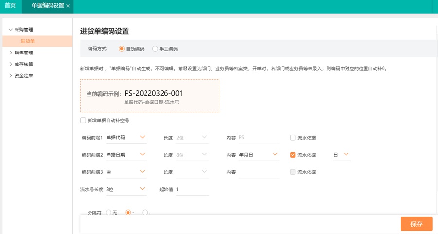 流水依据:如果选择,单据的编号流水依据可以和单据前缀中选择结果不一致;否则单据编码的流水为长流水