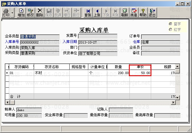 一、进入“核算模块”,打开“采购入库单”—“增加”,录入存货名称:木材,数量:200,单价:50元。录入完毕后点击“保存”。(仓库存货的计价方式为“全月平均法”)。