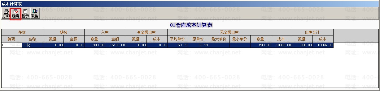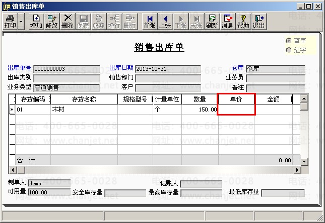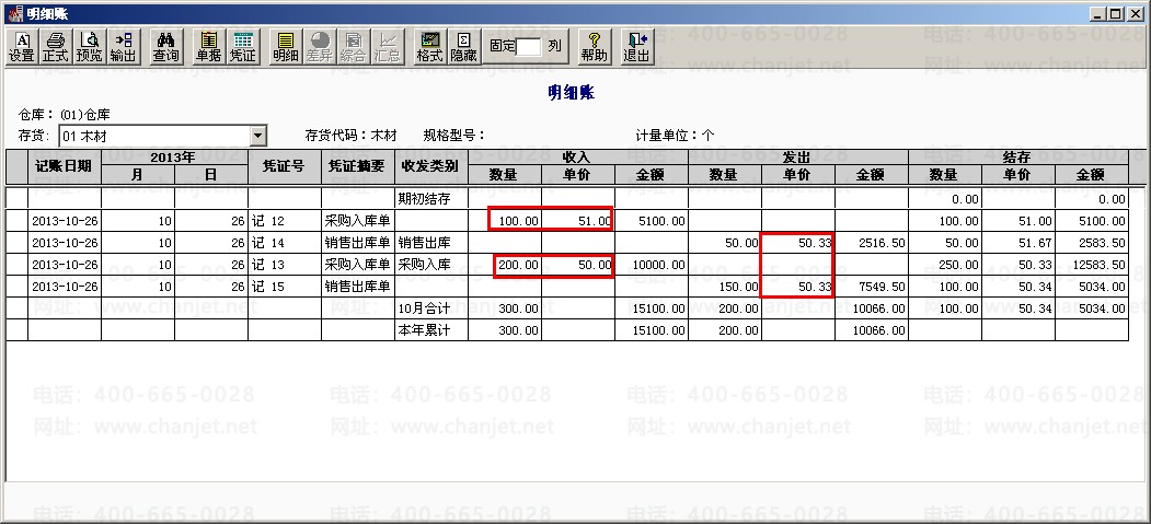五、重新打开“销售出库单”,单价自动反填。(由于之前采购过一次货物,因此使用“全月平均法”计价时,单价为50.33,如图:核算明细表)