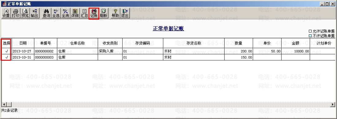 三、对10月份的采购入库单和销售出库单进行记账。依次点击“正常单据记账”—勾选“仓库”---点击“确定”,进入“正常单据记账”界面,勾选“单据号”栏中的“选择”,最后点击“记账”。