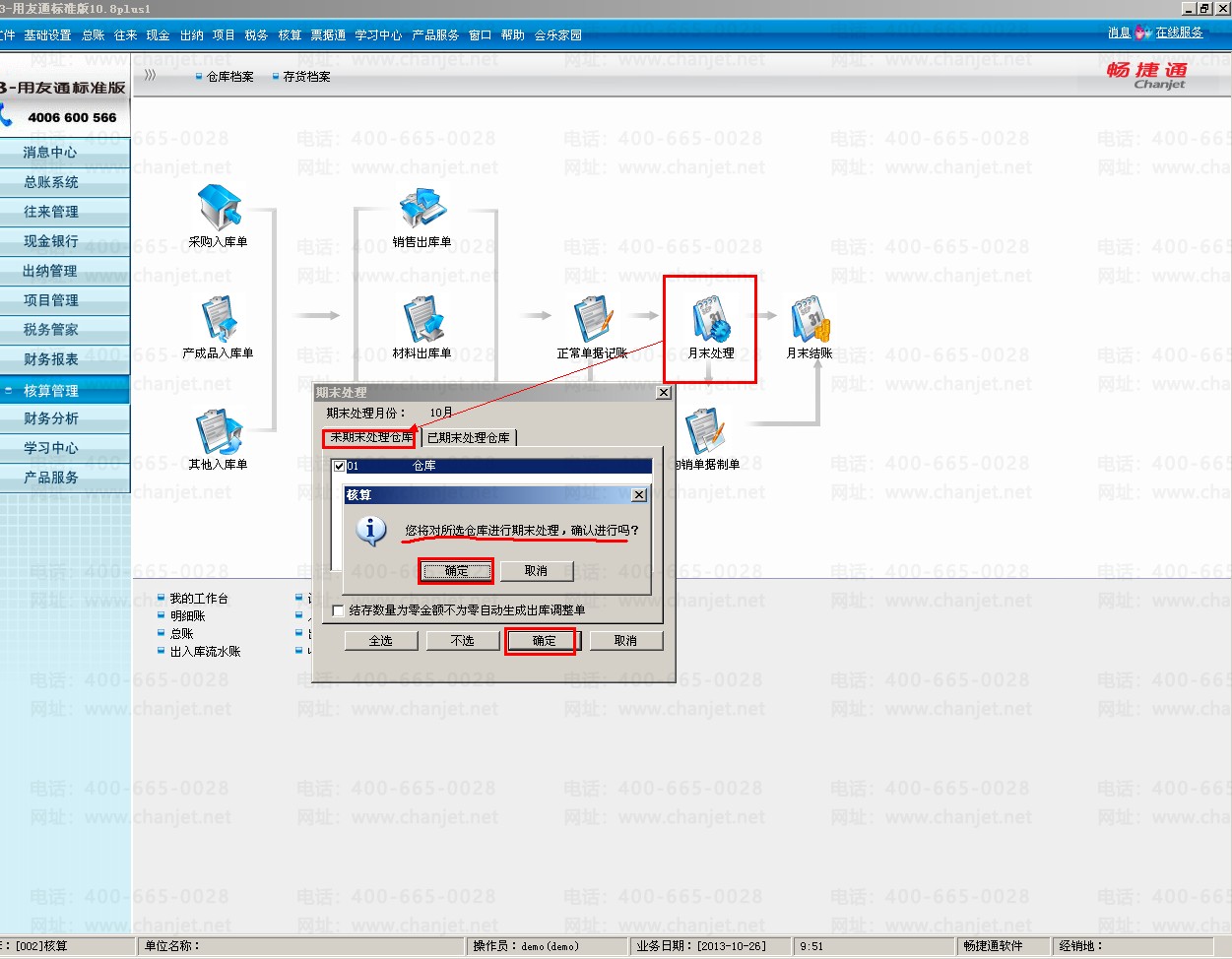 四、依次点击“月末处理”—在“未期末处理仓库”中勾选“01仓库”—点击“确定”,弹出“核算”界面后点击“确定”,在弹出的“成本计算表”界面中点击“确定”,提示:“期末处理完毕”后点击“确定”。