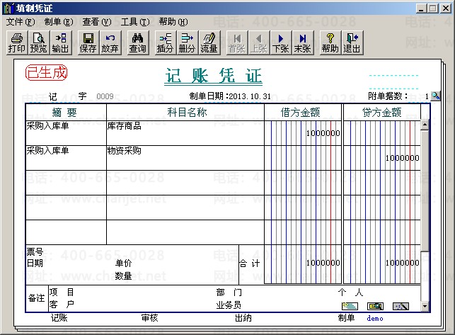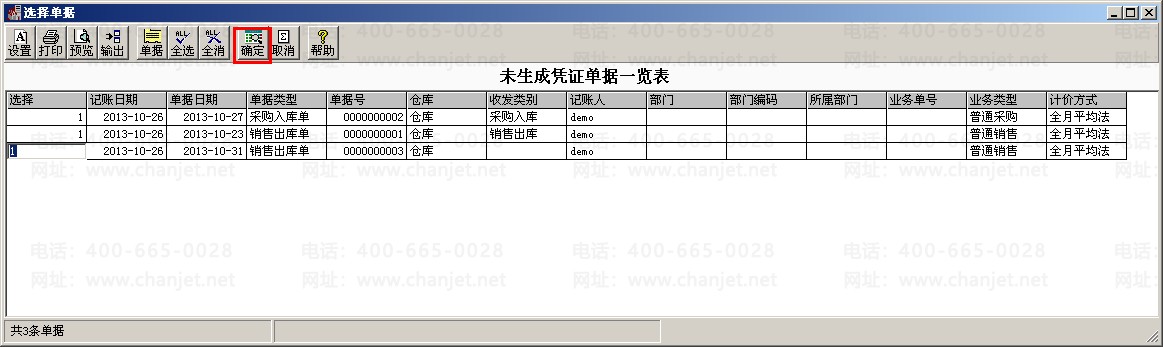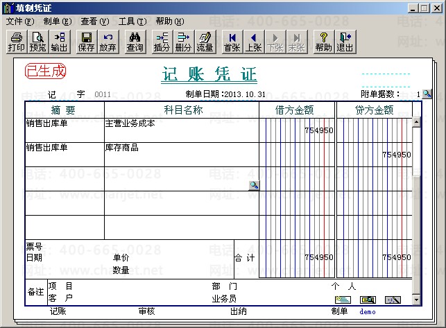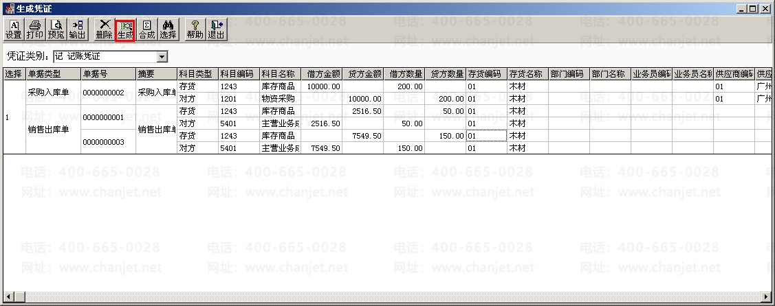 2、自动生成如下凭证(因为仓库存货采用的是“全月平均法”,所以需要对本月的出入库单据一并进行处理,因此凭证生成也是同时生成)。