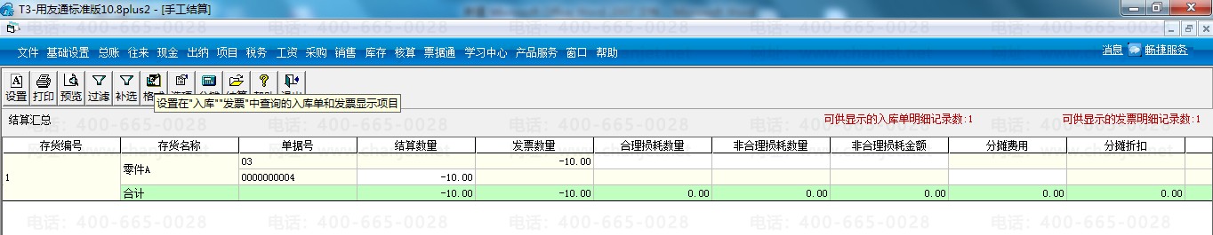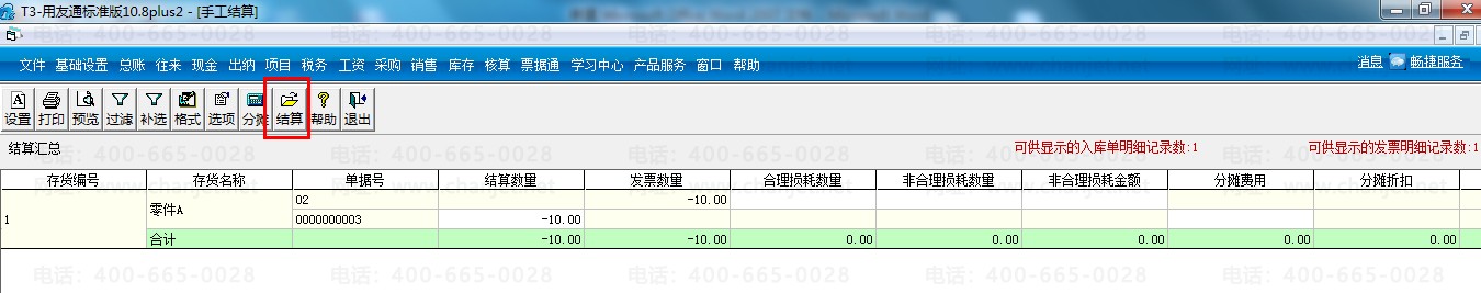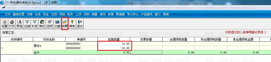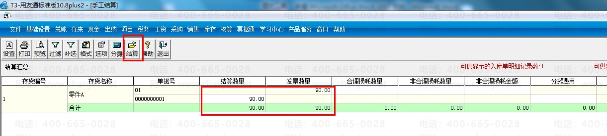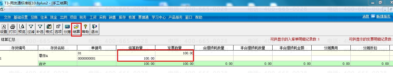 出现该界面:将采购入库单的数量由100该为10后点击结算(可以冲销退货的10个)