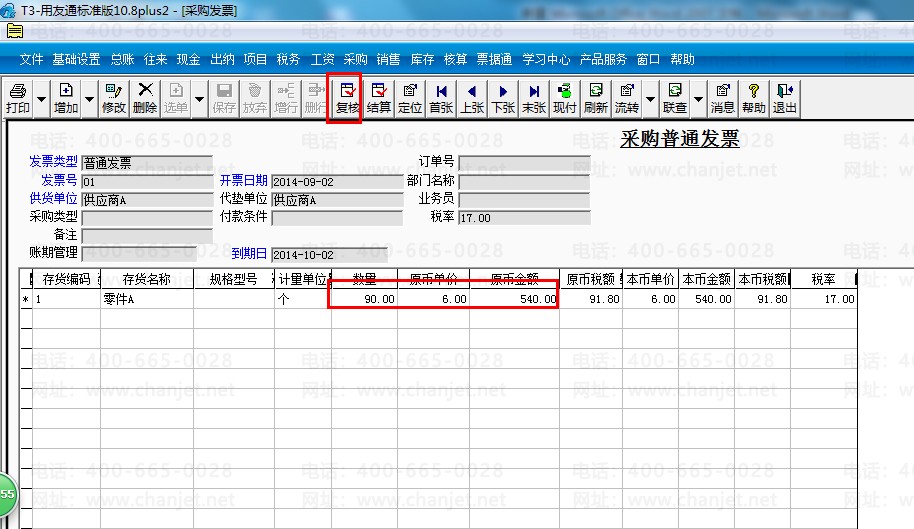 选中采购管理中的采购发票,点击增加(数量90,单价6元(含税))后保存并审核(会形成一笔应付款):