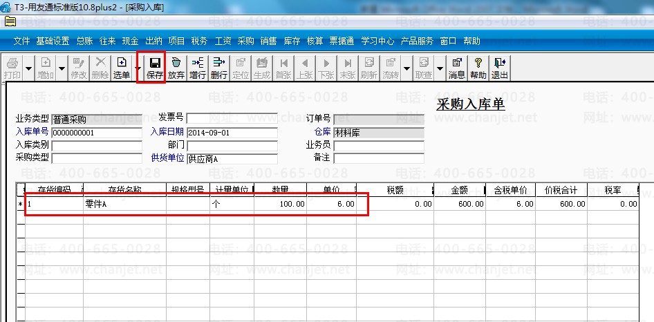 1.填制一张采购入库单(数量100,单价6元):选中采购管理中的采购入库单,点击添加,写入采购数量金额,供应商等信息,点击保存: