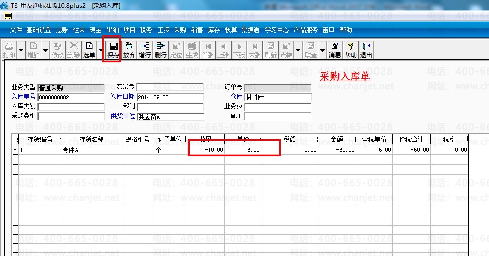 a.填制一张红字采购入库单(退货单):点击采购入库单上的增加-采购入库单红字,填制数量-10,单价6元等信息后点击保存: