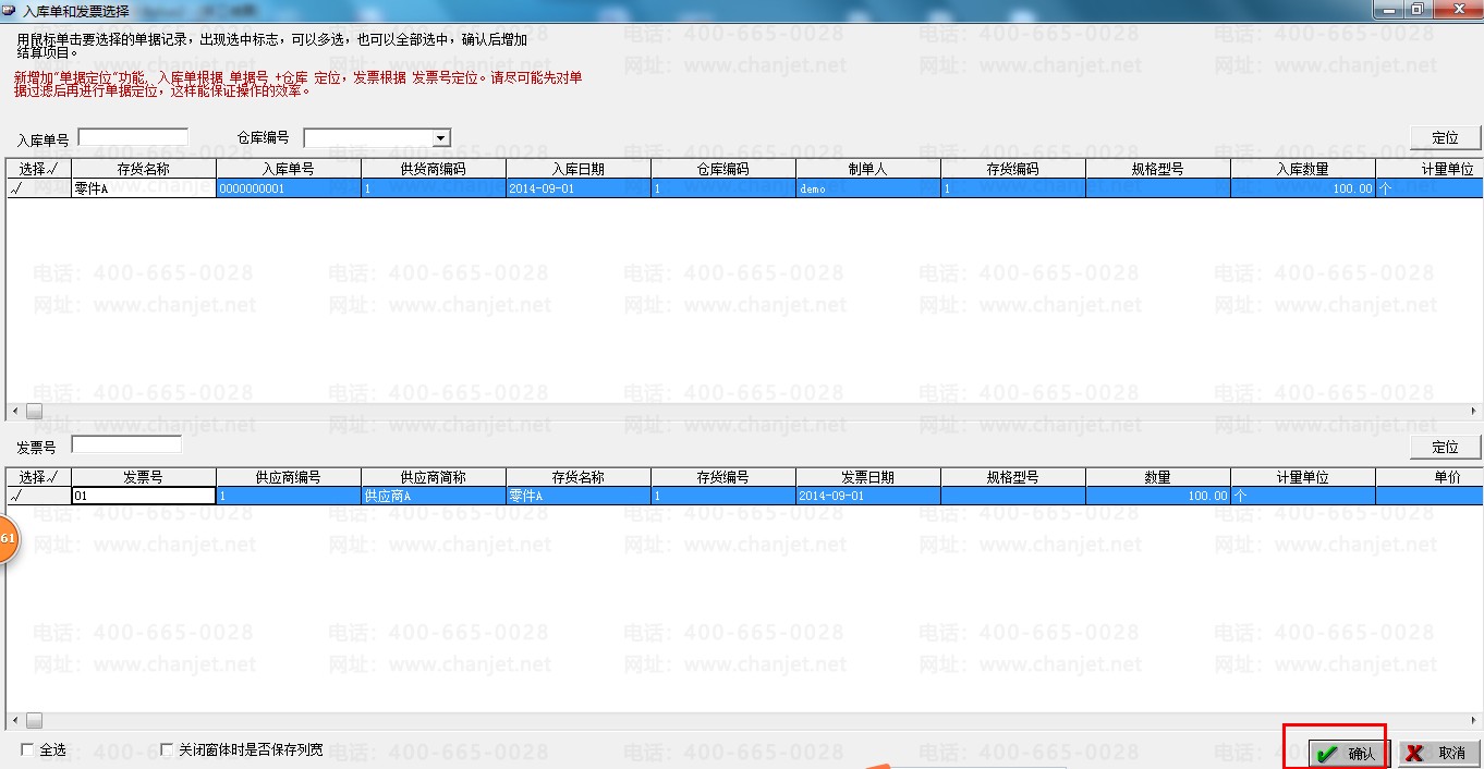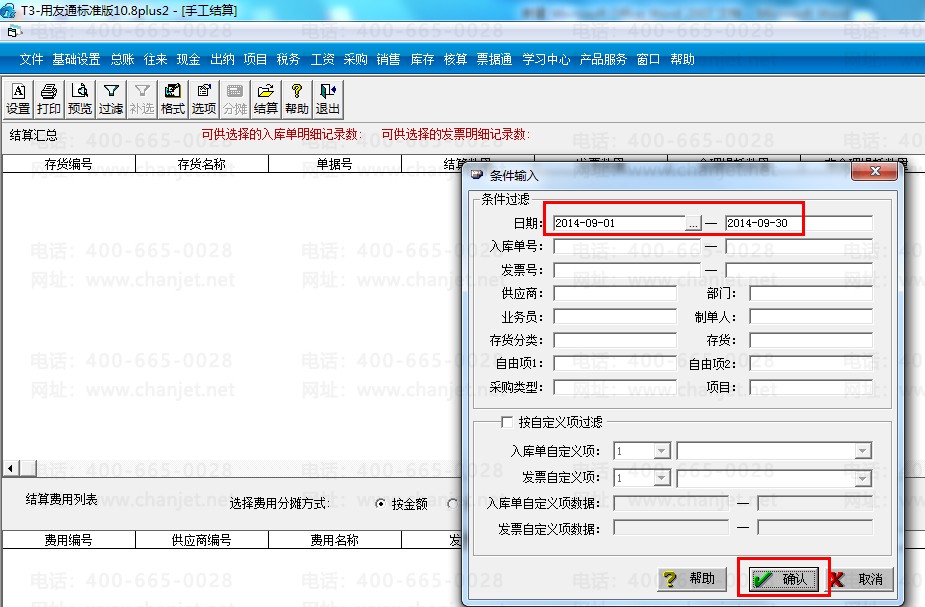 选中采购模块的采购结算选中日期范围点击确定:选中采购入库单(数量100)和采购发票(数量100)确认后点击结算