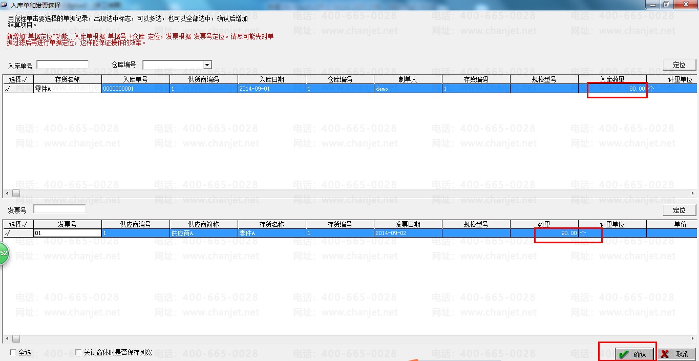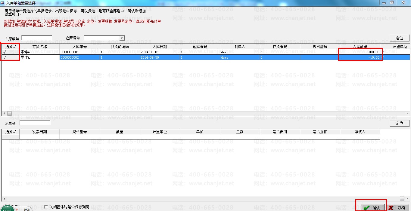 选中采购入库单(入库数量100个)和红字采购入库单(入库数量-10个)后点击确认