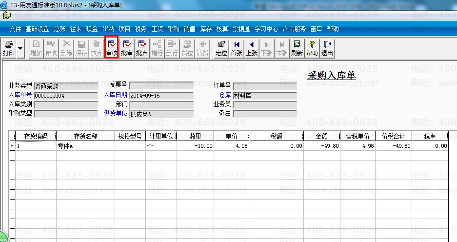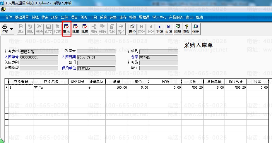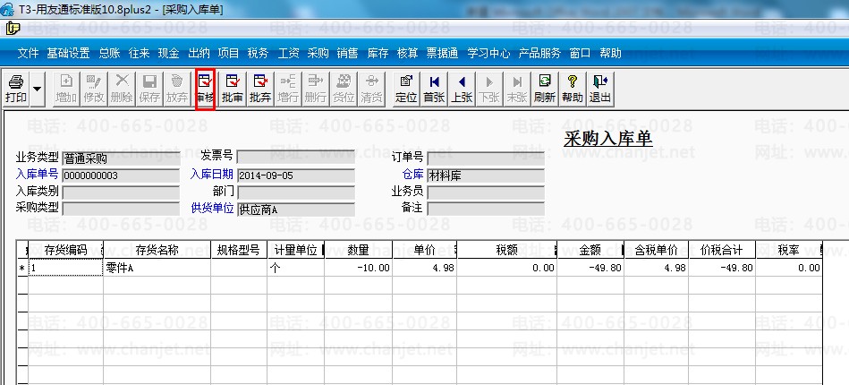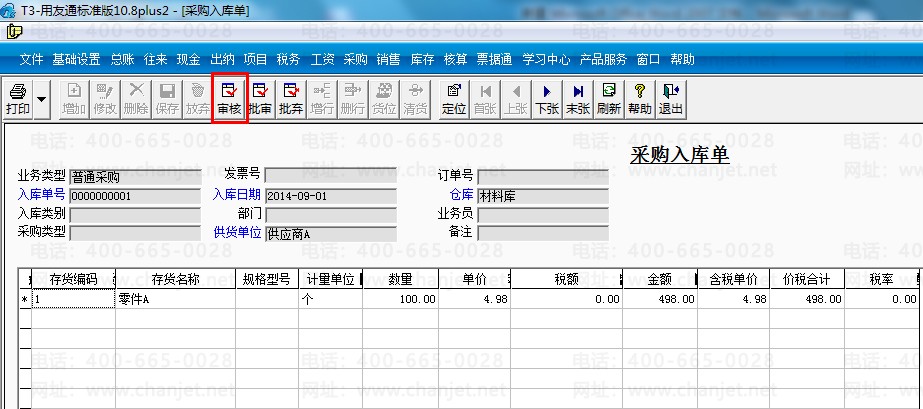 选中库存模块的中的采购入库单审核,选中该采购入库单点击审核