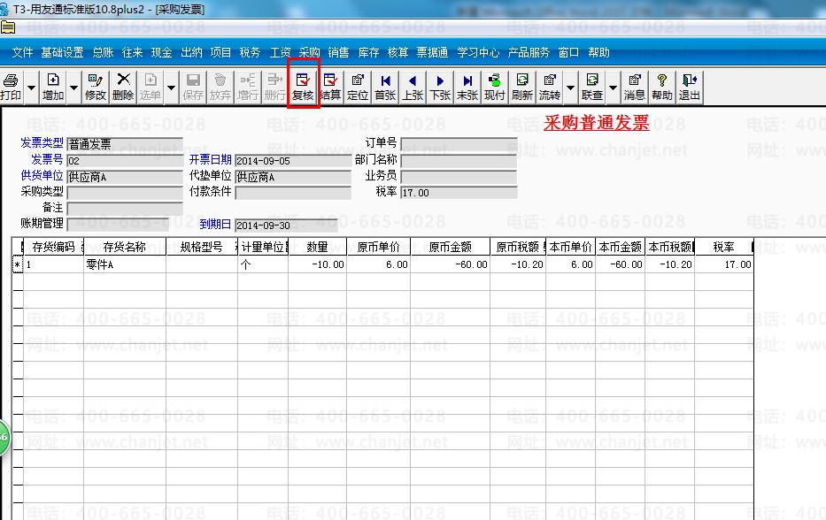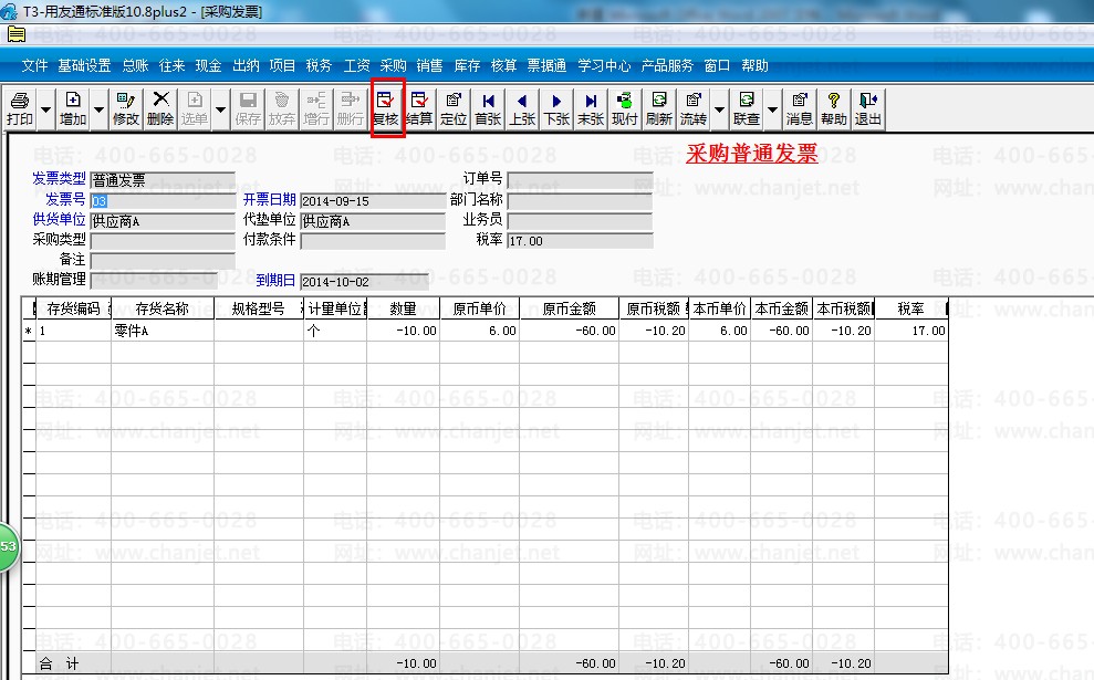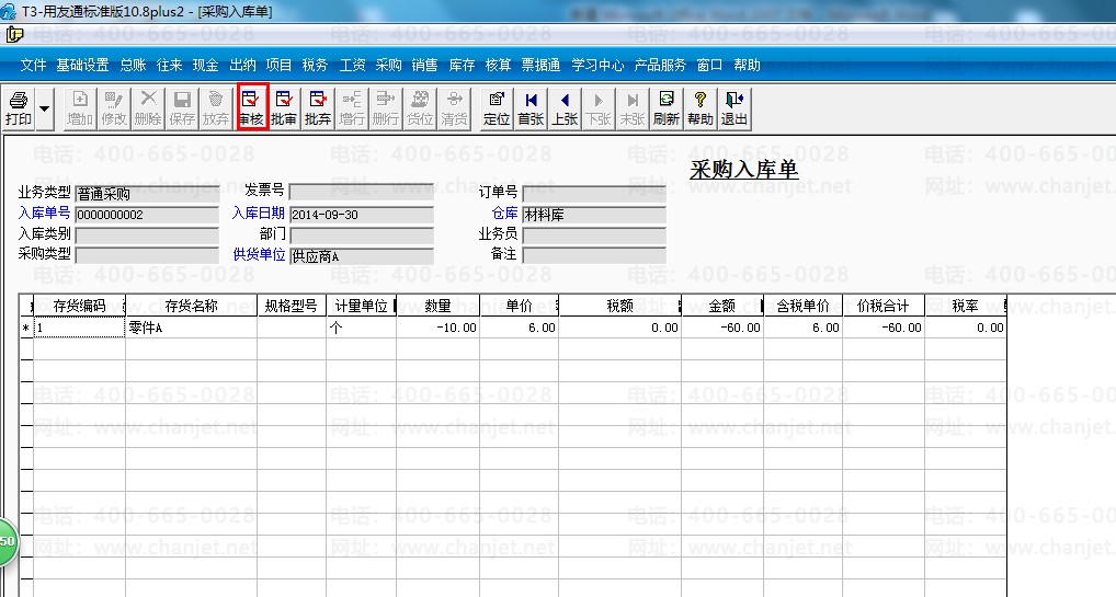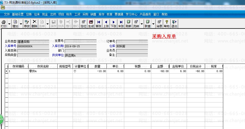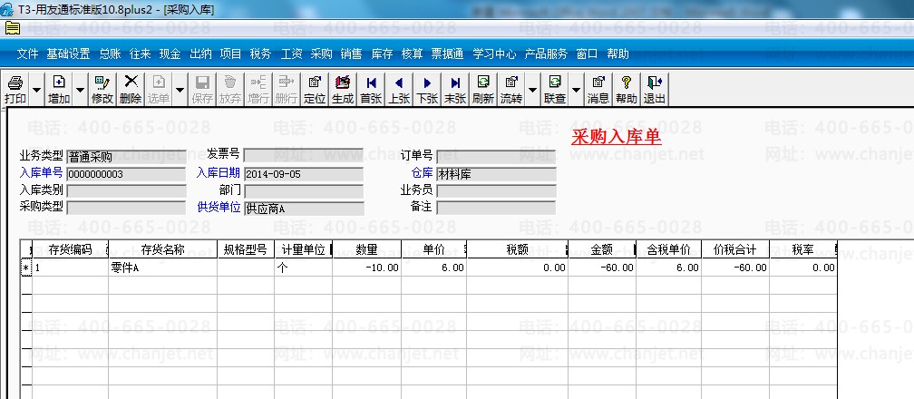 2.填制一张红字采购入库单(退货单):点击采购入库单上的增加-采购入库单红字,填制数量-10,单价6元等信息后点击保存