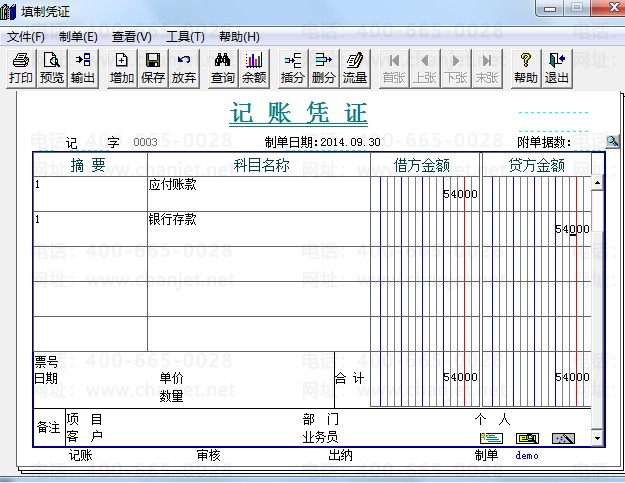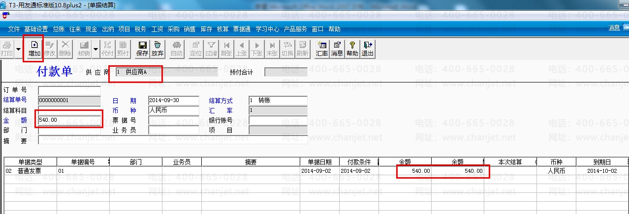 5.付款结算:9月30号支付供应商A货款540元(选中采购管理中的付款结算,输入日期范围后点击确定)后出现一张付款单,在供应商选项中选择供应商A后点击增加(输入金额540并选则结算方式)后保存