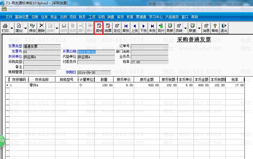 收到发票-流转生产采购普通发票:点击采购入库单上的流转(采购普通发票)(数量100,单价6元(含税)税率17%)保存并审核(形成一笔应付款)