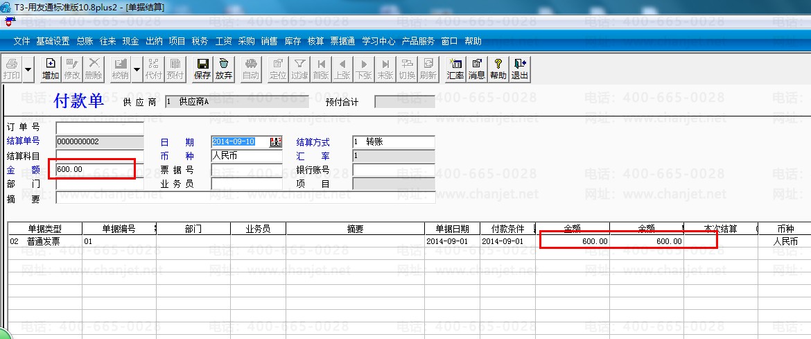 3.付款结算9月10号支付供应商A货款600元(选中采购管理中的付款结算,输入日期范围后点击确定)后出现一张付款单,在供应商选项中选择供应商A后点击增加(输入金额600并选则结算方式)后保存