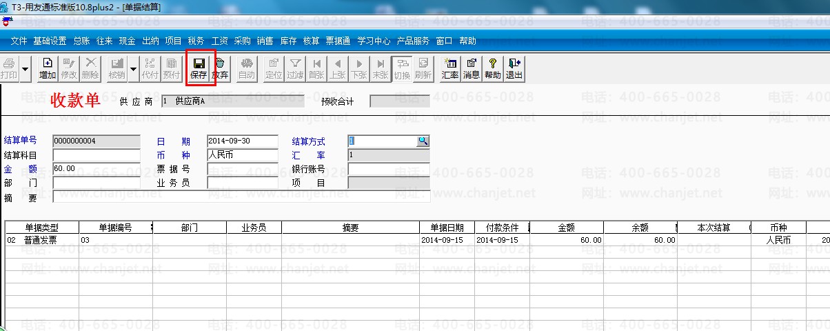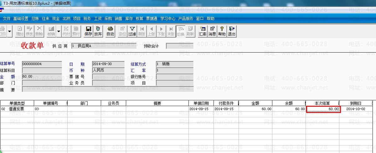 5.填写一张红字付款单(选中采购管理中的付款结算会出现一张付款单点击切换则变成红字的付款单即收款单,在供应商选项中选择供应商A后点击增加(输入金额60并选择结算方式)后保存