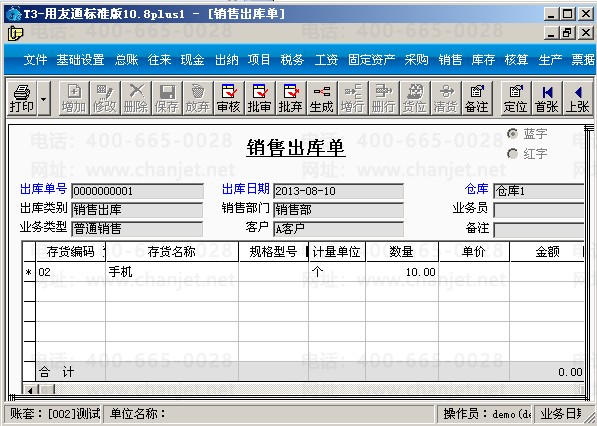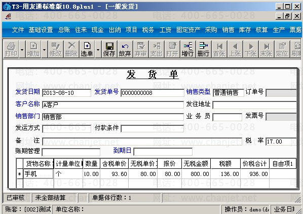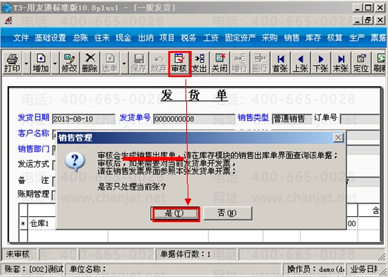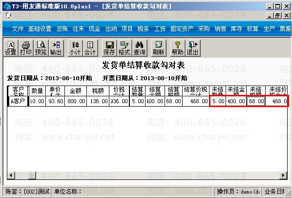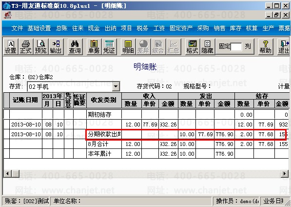 A 公司 2013年8月8日与B 公司签订一份分期收款销售合同。合同规定销售文具数量为 10 个,销售总金额为 800 元,货款分两次次收取,2007.8.15 第一次收取 400 元,2013.9.15 第二次收取400 元。该批商品的总成本为 500 元,本企业在T3软件中该如何操作?