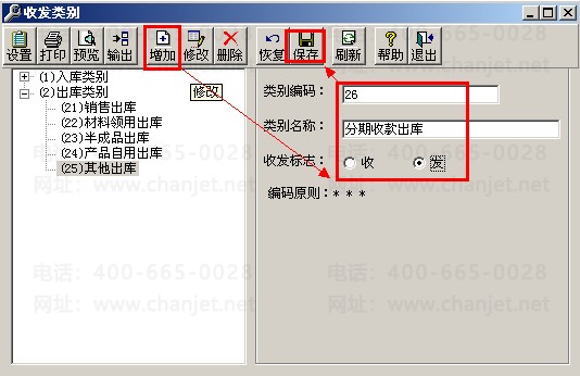 (1)先增加一个分期收款出库的出库类别。在“基础设置”-“购销存”-“收发类别”-“增加”,输入类别名称(分期收款出库)出库类别。