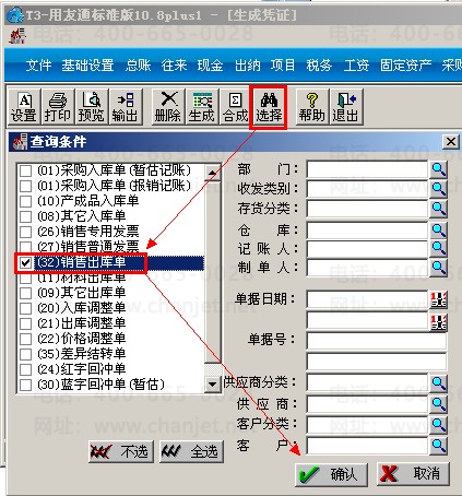 (8)点击“购销单据制单”-“选择”,勾选销售出库单后确定。