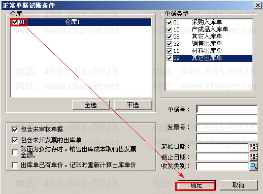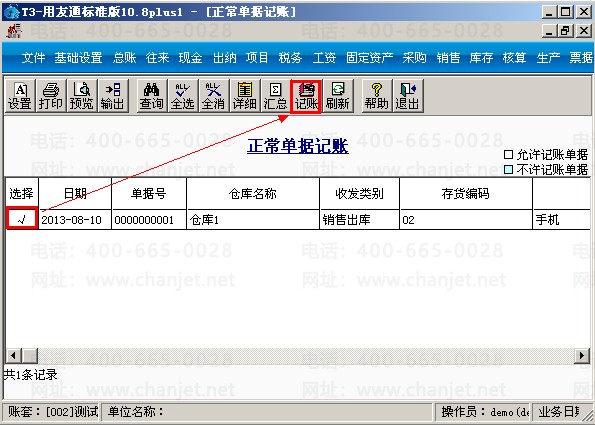 (7)对销售出库单正常单据记账。在核算模块点击“正常单据记账”,选择仓库后确定;选择单据后点击“记账”。