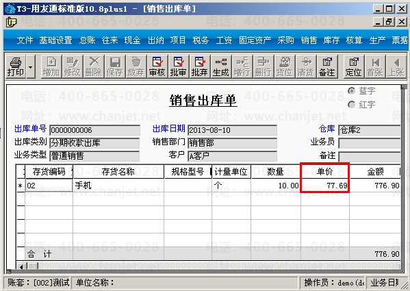 注:在移动平均法下,正常单据记账之后销售出库单的单价会反填,查看销售出库单: