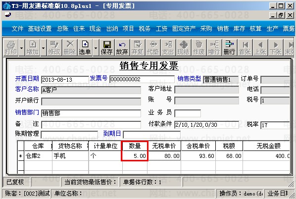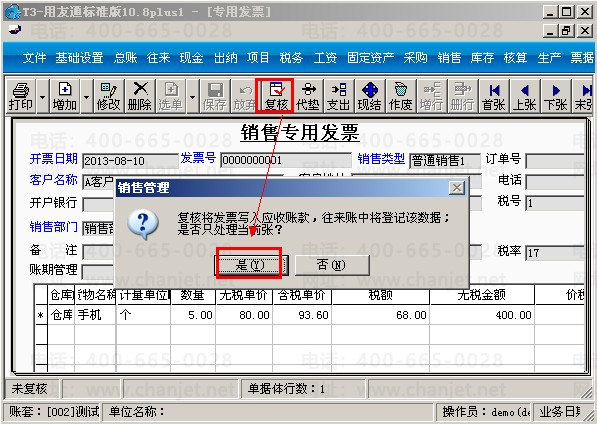 (10)按照合同,第一次收款日,由销售发货单生成销售发票,修改发票数量为5,确认销售收入为 400 元(再对销售发票进行复核)。
