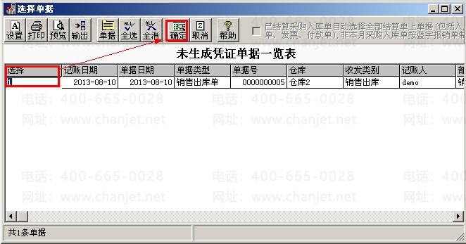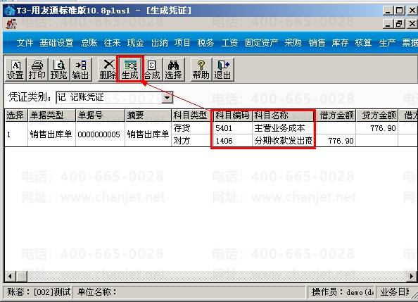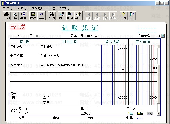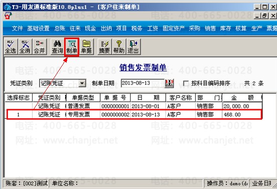(15)在核算模块点击“客户往来制单”选择“发票制单”后点击“确认”;选择要制单的单据后点击“制单”输入科目名称凭证就生成了。