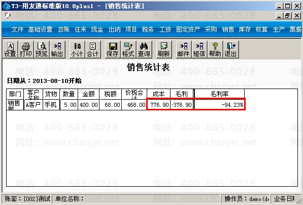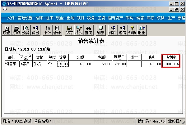 (13)查询“销售统计表”,查询的毛利是该次收入减去所有成本的毛利。