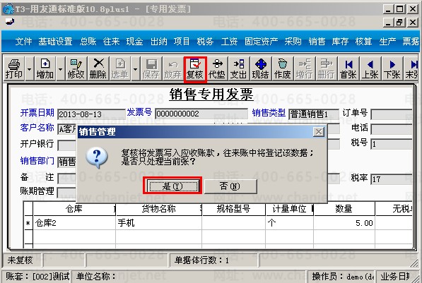(14)第二次收款日,仍由销售发货单生成销售发票,选择之前那张发货单,流转生成销售专用发票,数量还5个,再对销售发票进行复核,如下图: