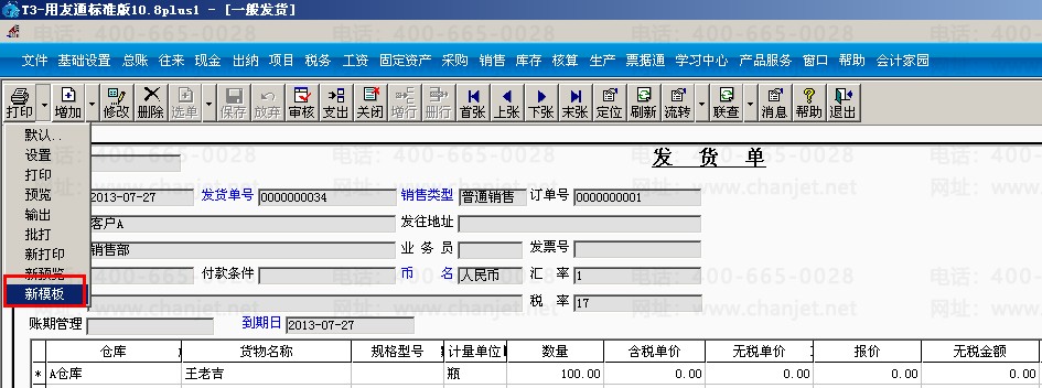 (1)打开销售管理模块,点击“发货单”,点击“打印”—“新模板”