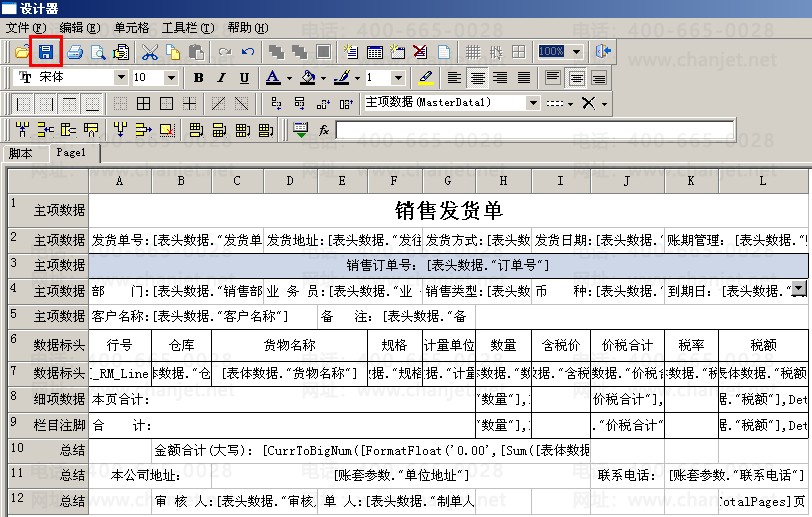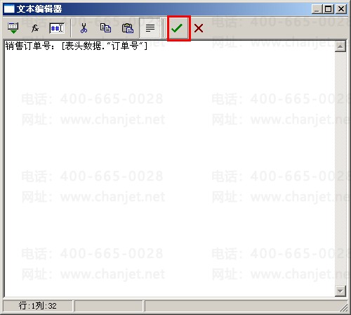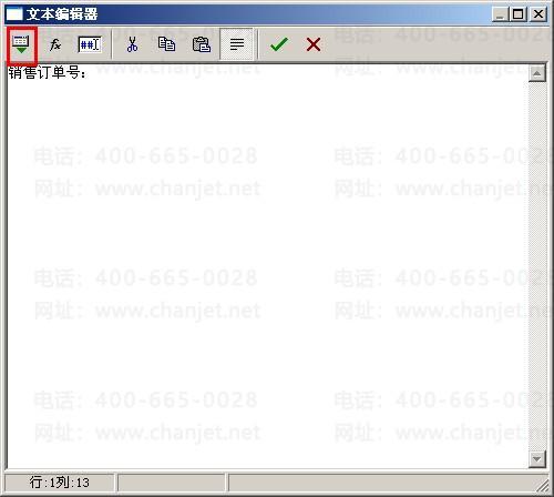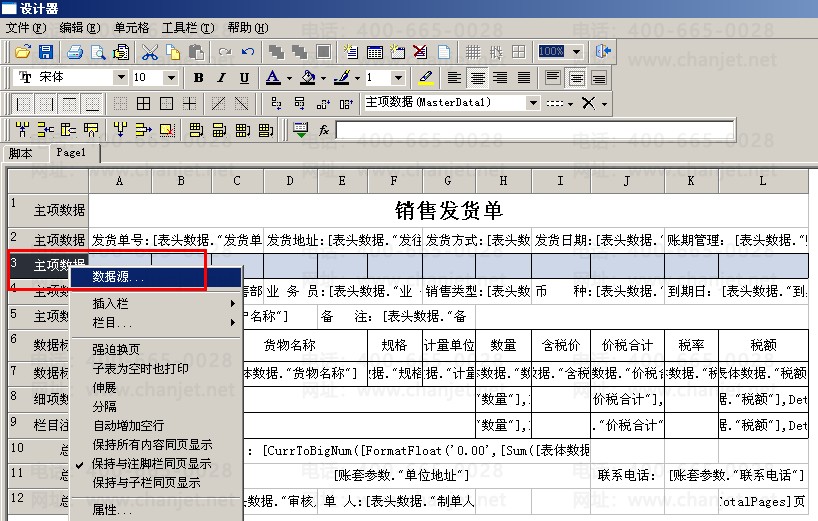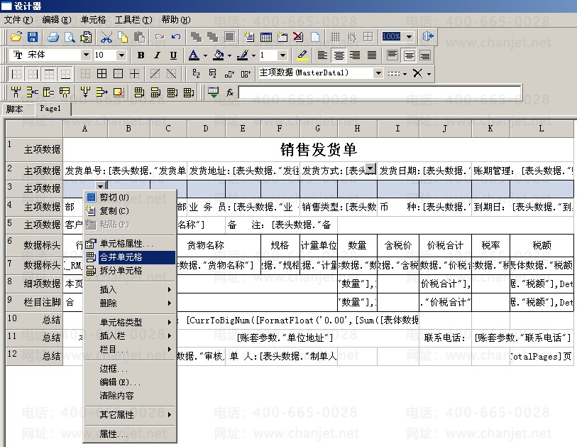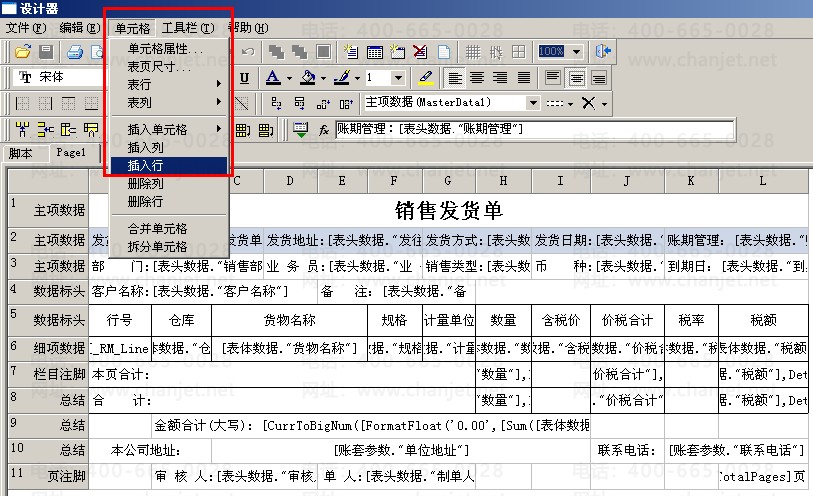 (3)打开模板,点击“单元格”—“插入行”,新增一行,为主项数据,数据源选择为表头项目,然后选中该行,右击“合并单元格”。再在该单元格中双击打开“文本编辑器”,在空白处输入“销售订单号:”--选择“表头数据”—“订单号”,点击“保存”,再进行预览打印。