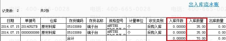 2、查询库存模块存货编号为05103069的出入库流水账,发现此存货有两张采购入库单,但是合计入库数量70,入库件数反而是0。