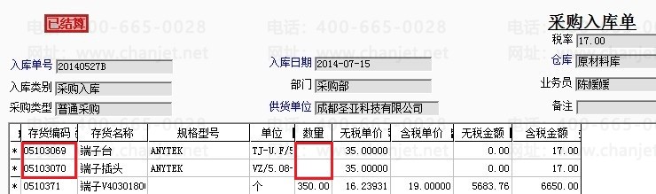 3、查询这两张采购入库单,发现有问题的这两个存货05103069和05103070都在这张单据上,并且在这张入库单上数量是空的,该张单据已结算,但是无法联查到采购发票和采购结算单。