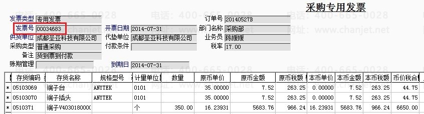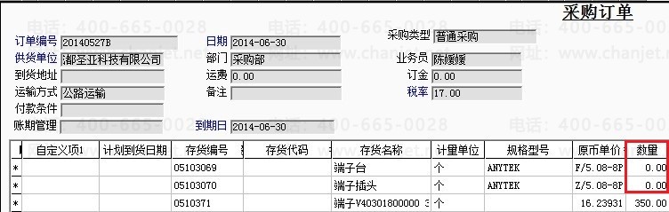 4、连查到采购订单,发现订单上这两个存货的数量就是0,可以联查到发票号是:00034683