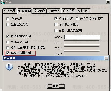 1、销售业务范围设置中勾选“客户信用控制”,并录入密码;