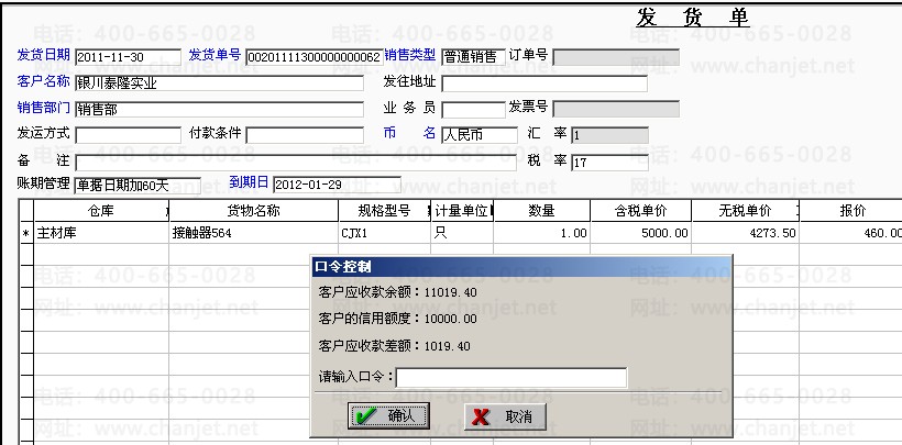 增加一张发货单,当发货单金额+应收账款余额大于客户的信用额度时,保存单据软件弹出提示,输入口令可继续保存;