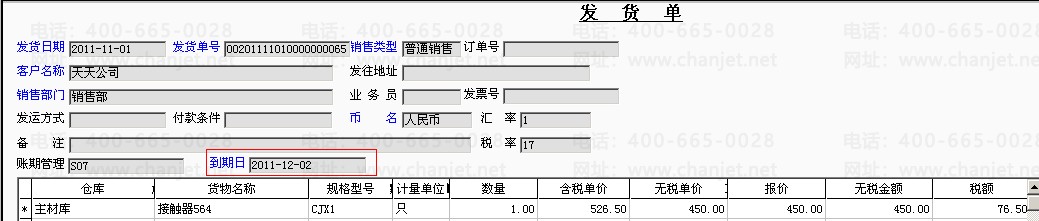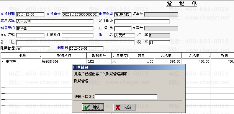 3、到2012年12月3日,继续增加该客户的发货单时,提示“此客户已超出客户的账期管理期限”,需要输入口令才能保存单据;