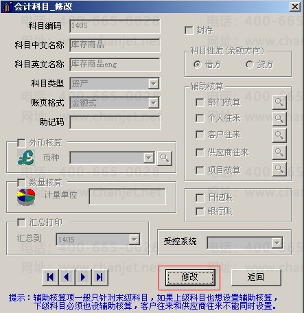 3.双击库存商品科目,弹出会计科目修改的界面,点击修改。