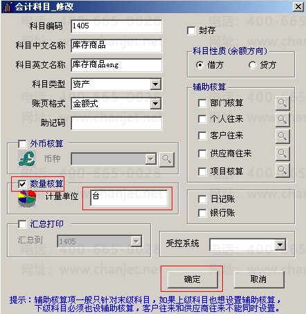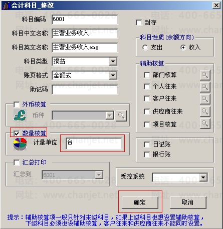 4.在会计科目修改中勾选数量核算,输入计量单位,点击确定。