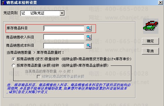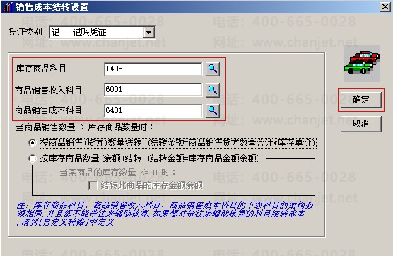 10.同上8-9操作,分别对商品销售收入科目、商品销售成本科目定义到主营业务收入科目和主营业务成本科目,全部定义完成后点击确定。(注:如果库存商品、主营业务收入和主营业务成本会计科目下设有二、三级科目,则必须要三者科目结构一致才可以结转。)