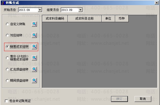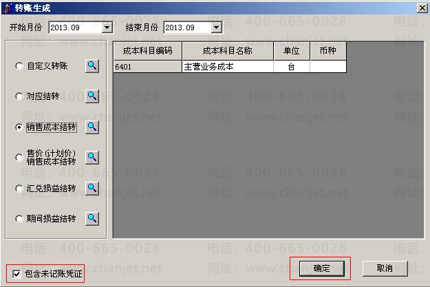 11.设置完成后,则可进行销售成本结转,点击确定。(如有未记账的凭证需要勾选包含未结账凭证。)