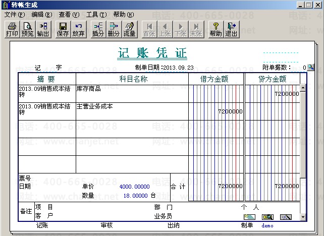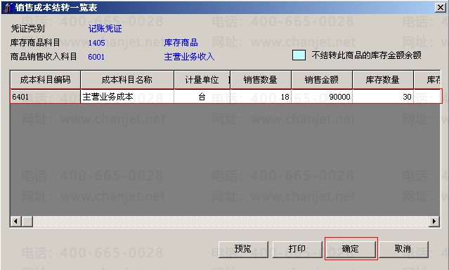12.点击确定后,会弹出销售成本结转一览表,点击确定后就会自动生成一张销售成本结转的凭证。