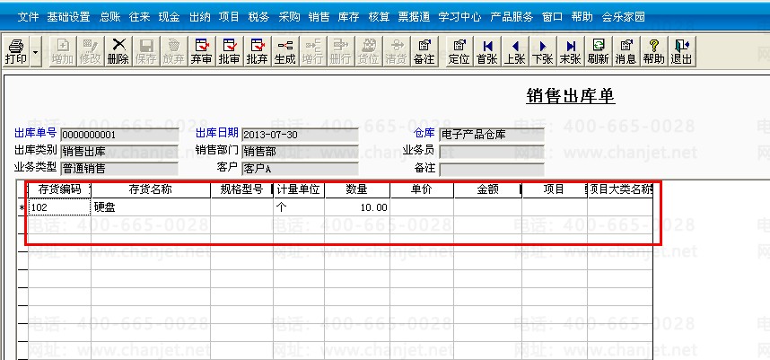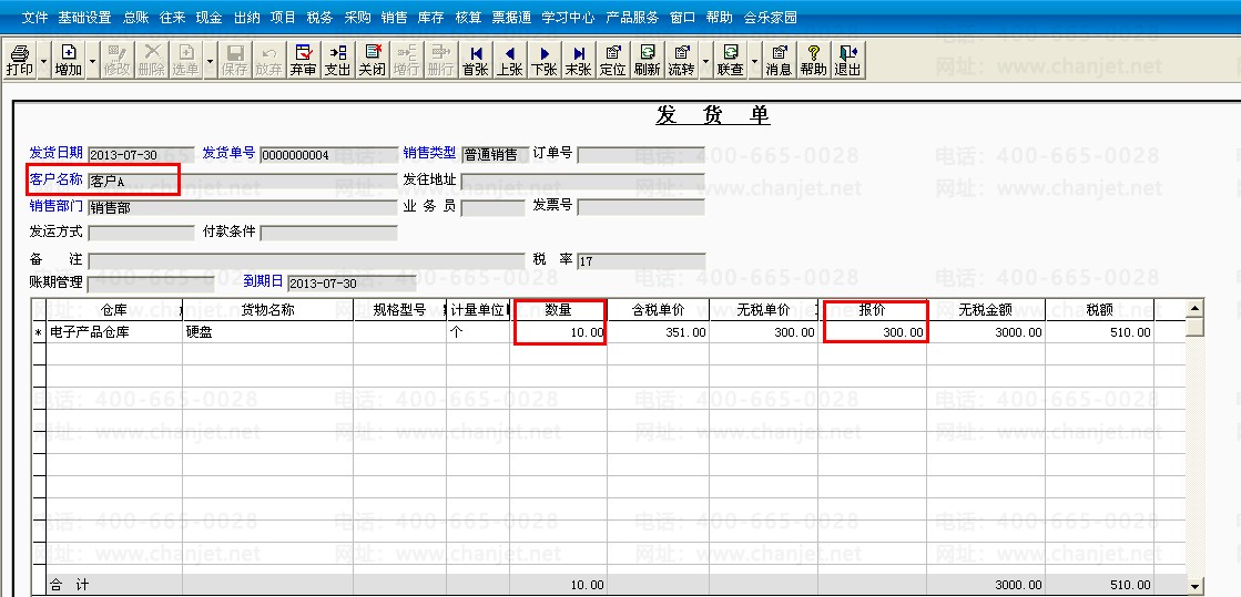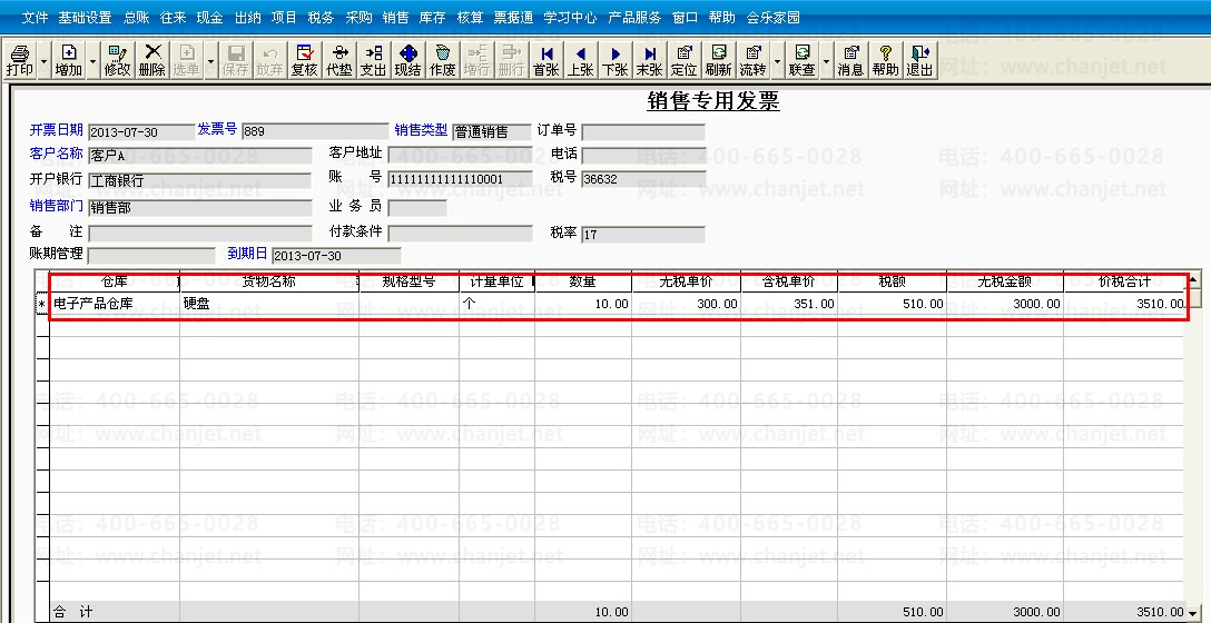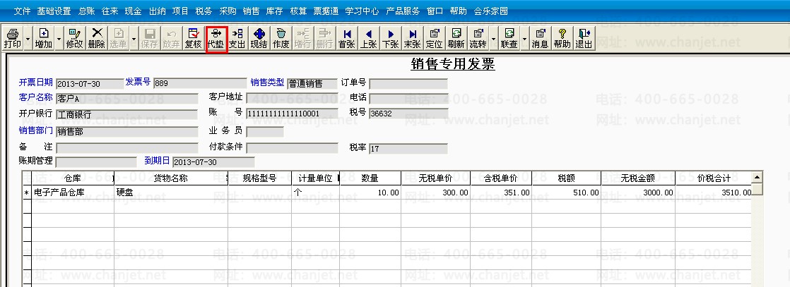 2013年7月30日,客户A从公司购买硬盘10个,单价300元(不含税)。销售部门下达发货通知并进行出库,开具销售发票(发票号:889)。硬盘由运输商C承运,公司代垫100元运输费用。运费发票开具给客户A,共应收客户A5950元。