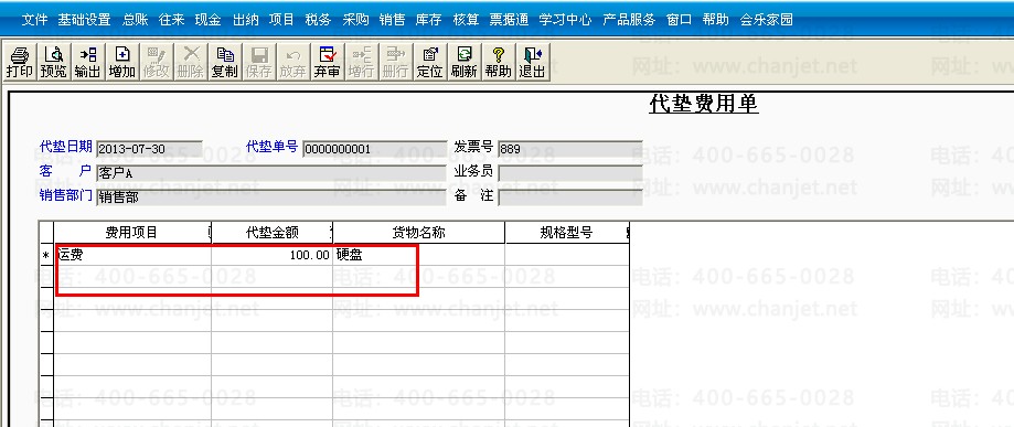 (4)点击发票上“代垫”按钮生成代垫费用单,填制100元的运费代垫费用单。