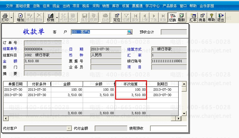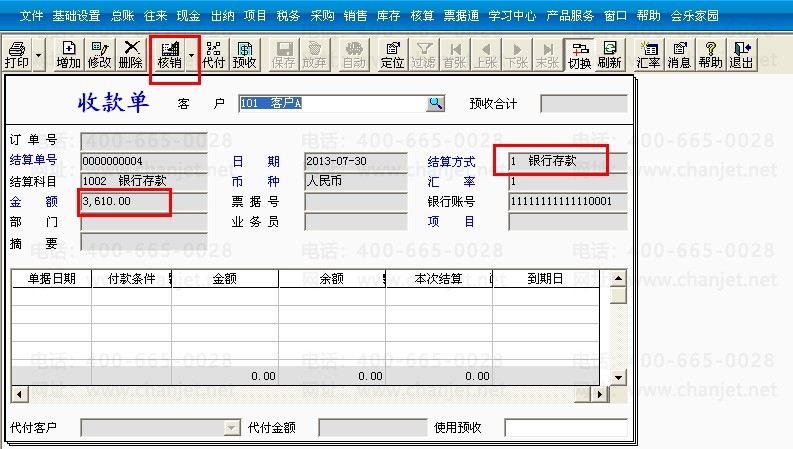 (6)客户A收到货之后将款项全部打入银行存款,填制收款单,收款结算时其他应收单也自动带出。