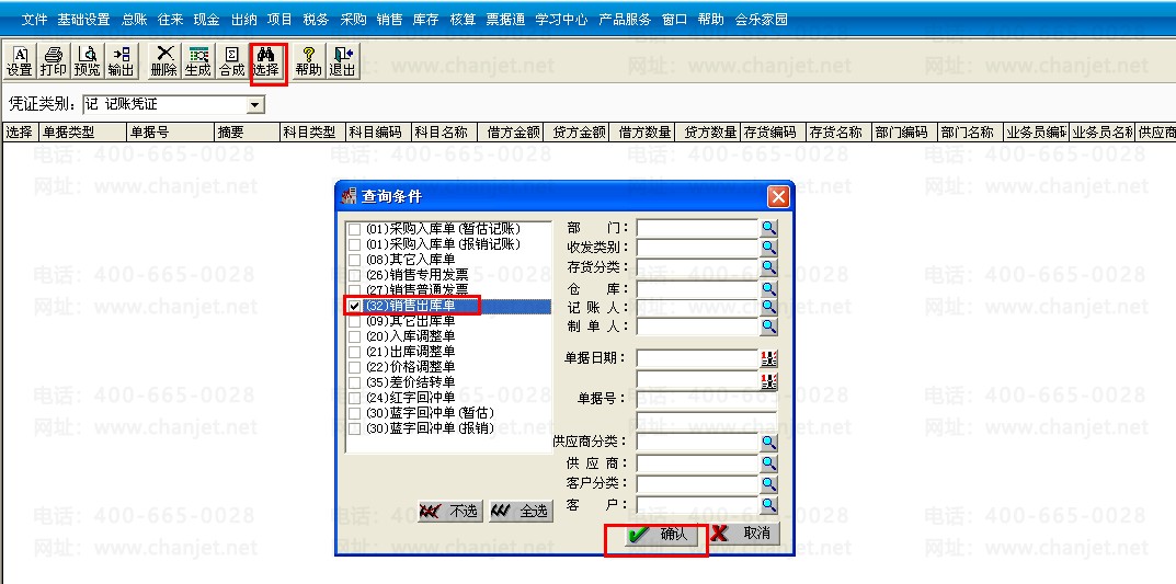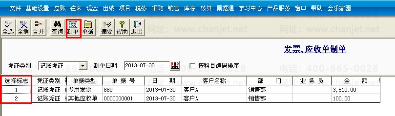 b、销售发票和应收单制单(点击“客户往来制单”-勾选“发票制单”和“应收单制单”):