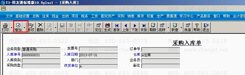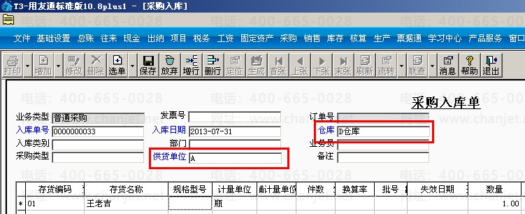 (3)填制“采购入库单”:打开“采购管理”--填制“采购入库单”,点击“增加”--选择之前修改过的“供货单位”后,自动带出“仓库”。