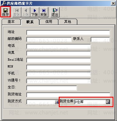 (2)点击“基础设置”--“往来单位”--“供应商档案”,双击打开需要修改的“供应商”,点击“联系”—“到货仓库”中选择需要存放的“仓库”。