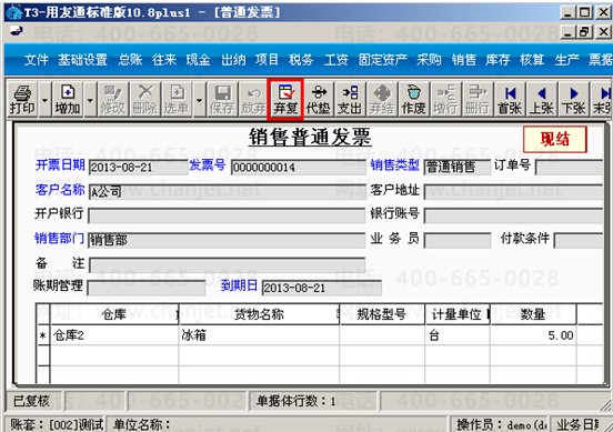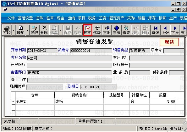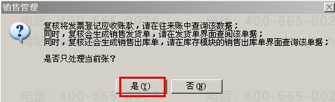 (3)在销售模块对该张销售发票进行审核,点击“复核”。